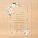 Invitación Primera Comunión. Elegant card design featuring watercolour delicate pink, white, ivory flowers, a faux gold shining cross, faux gold frame, on a transparent background. Use Personalize tool to add your info. For matching items, please, visit my Transparent Holy Communion Collection.