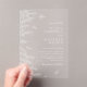 Anuncie su día especial con una claridad impresionante utilizando este exquisito diseño personalizado sobre acrílico transparente. Delicados contornos botánicos blancos en cascada a lo largo de un lado, enmarcan sus detalles con un fondo claro. Esta impresionante obra de arte minimalista ofrece una elegancia etérea y moderna, creando una impresión verdaderamente única y memorable.