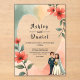 Esta elegante invitación acuática floral boda acrílica es perfecta para un boda moderno. El diseño romántico presenta un marco floral de color agua elegante con un ilustracion de novia y novio y una caligrafía negra con un fondo blanco.
