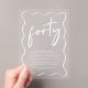 Elevar su fiesta de 40 años con esta clara invitación acrílica que incluye un moderno borde blanco ondulado, "cuarenta" en un gran guión blanco de moda, su nombre en una elegante tipografía de sari blanco y los detalles fiestas con letras sencillas y modernas,