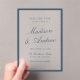 Share your wedding date in classic style with this navy border acrylic save the date card. The deep navy frame set against a clear acrylic background creates a bold yet timeless contrast that feels both formal and modern. Elegant calligraphy highlights the couple’s names, while refined serif lettering presents the date and location with balanced sophistication. Ideal for black tie weddings, coastal venues, traditional ceremonies, and modern classic weddings, this acrylic save the date pairs beautifully with coordinating navy wedding invitations.
