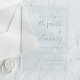 Esta sencilla y moderna invitación a la boda presenta un polvoriento texto azul sobre un fondo claro. Añada los nombres de la novia y del novio en una caligrafía elegante de escritura a mano y los detalles en letra sans serif.