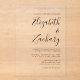 Esta sencilla y moderna invitación a la boda incluye un texto negro sobre la elección de un fondo claro o esmerilado. Añada los nombres de la novia y del novio en una caligrafía elegante de escritura a mano y los detalles en letra sans serif.