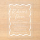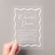 Invite a sus huéspedes a su cena de ensayo con estilo con nuestras invitaciones a la cena del boda Modern White Wavy Frame. El diseño presenta las palabras "Cena ensayada" mostradas en un guión blanco escrito a mano que contrasta con un fondo acrílico transparente. Un borde blanco ondulado rodea los detalles del ensayo de la cena. Esta cena retro es perfecta para cenas informales y modernas.