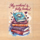 A cozy book lover quote celebrating weekends spent reading. Decorative stacked books with hearts create a warm and relaxed reading mood for people who love quiet time with stories.