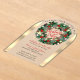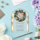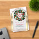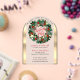 Esta hermosa invitación a la fiesta de Navidades con forma de arco y bandas laterales doradas es muy tendencia. La corona está decorada con cañas de pino, azulejos blancos, rojos y azules, estrellas doradas y copos de nieve. Todos los textos están escritos con tipografía refinada y son personalizables. ¡Ideal para los Navidades modernos!
