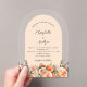 For an elegant and romantic wedding. A clear, transparent background decorated with orange, peach and pink florals. Arch shaped frame. Personalize and add your names and details.