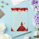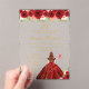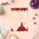 Esta elegante y glamorosa invitación a la fiesta de cumpleaños incluye una hermosa princesa con el pelo rojo pardo y piel clara en un vestido de bola roja. El texto combina el guión manuscrito y las fuentes sans serif modernas para un aspecto elegante y sofisticado. Los arreglos florales, las mariposas y los confeti dorados crean una perfecta mezcla de rústico y moda. Gráficos de www.etsy.com/uk/shop/SunflowerDayLove