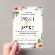 "Esta invitación a una boda acrílica de personalizable 5×7" presenta vibrantes flores de acuarela impresas en un acrílico de primera calidad de 15 mil escarpado, lo que crea un impresionante aspecto moderno. Ideal para los bodas del jardín o del boho. Incluye la opción RSVP. Impresión a prueba de agua, duradera y de sangre completa. Plantilla lista: simplemente agregue nombres y fechas".