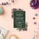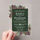 Invite a sus seres queridos a compartir su alegría en su día de boda con estas hermosas invitaciones de acrílico. El diseño boho chic elegante presenta sus nombres mostrados de manera prominente en letras negritas, mientras que la introducción y otras notas presentan caligrafía con florituras en los extremos de las letras. El texto se muestra sobre un fondo de color verde bosque marmolado. El borde exterior de la invitación es de acrílico transparente con piñas y ramas de pino pintadas a mano decorando las esquinas. Elegantes, clásicas, sofisticadas y hermosas, estas invitaciones de boda son perfectas para una boda de invierno o en la montaña.