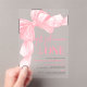 Girls Just Wanna Be ONE clear acrylic 1st birthday invitation. This modern, see-through design is printed on clear acrylic for a sleek and stylish look that lets your party details shine. The invitation features a playful watercolor bow with a ribbon frame accenting the top and left side, adding a sweet and girly touch without feeling overdone. The phrase “Girls Just Wanna Be ONE” appears at the top in a mix of fun script and classic serif fonts, setting the tone for a charming first birthday celebration.