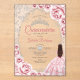 Pink silver Quinceanera celebration invitation. Features, brunette girl in ball gown dress, script font, silver butterflies, watercolor roses and tiara. Perfect for an elegant princess style glam celebration. Personalize with your own details. Stylish transparent or frosted acrylic invitations.