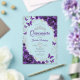 Purple silver and white Quinceanera celebration invitation. Features script font, silver butterflies, watercolor roses and tiara. Perfect for an elegant princess style glam celebration. Personalize with your own details. Stylish transparent or frosted acrylic invitations.