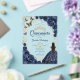 Navy, gold and white Quinceanera celebration invitation. Features brunette girl in ball gown dress, script font, gold butterflies, watercolor roses and tiara. Perfect for an elegant princess style glam celebration. Personalize with your own details. Stylish transparent or frosted acrylic invitations.
