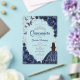 Navy silver and white Quinceanera celebration invitation. Features script font brunette girl in ball gown dress, silver butterflies, watercolor roses and tiara. Perfect for an elegant princess style glam celebration. Personalize with your own details. Stylish transparent or frosted acrylic invitations.