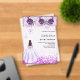 Para una elegante Quinceañera. Un trasfondo claro y transparente. Decorado con confeti morado, mariposas, rosas rosados y violetas y un chica vestido. Personalice y agregue un nombre, edad/texto y detalles del fiesta. El nombre se escribe con un guión de estilo con letras a mano