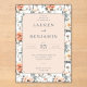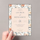 This elegant wedding invitation features a romantic floral design with soft pastel tones, including peach, blue, green, and pink. The layout is symmetrical, showcasing large, detailed flowers like peonies or roses in a lush garden-like pattern surrounding the central text area. The typography combines classic serif fonts with varying weights to create a sophisticated hierarchy, enhancing readability and visual appeal. Perfect for formal occasions, this design exudes warmth and sophistication, making it ideal for celebrating love and commitment.