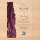 El borde izquierdo de esta elegante y moderna invitación a la boda incluye una acuarela color rojo burdeos recortada con un falso rosa de purpurina de oro. El texto del personalizable combina la escritura a mano, el copperplate y el cursiva en gris carbón sobre un fondo claro, junto con un código QR que los huéspedes pueden explorar para visitar su sitio web y RSVP, lo que ahorra el coste de imprimir y enviar tarjetas RSVP separadas.