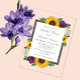 El diseño presenta elegantes girasoles, rosas y margaritas con una paleta de colores dorados amarillo, morado y blanco. El diseño también incluye un marco gris de carbón vegetal. Puede cambiar el color de fondo en la parte delantera y de vuelta al color de su elección o dejar ambos en blanco.