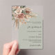 Establece el tono de tu día especial con esta elegante invitación a la boda. Con un fondo transparente y claro, con un armazón color verde sabio, está bellamente adornado con rosas mudos y tierra, eucalipto verde y pampas hierba para un ambiente natural y romántico. Personalízalo con tus nombres y detalles del boda para crear una invitación única y memorable que refleje tu estilo. Perfecto para parejas que buscan un diseño moderno pero atemporal para su celebración.