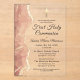 Una bella y elegante invitación a la Primera Comunión Santa diseñada con un suave patrón de aguijón rosa y oro. Impreso con acrílico premium, esta invitación ofrece un toque moderno y lujoso. Los suaves tonos rosas combinados con los brillantes acentos dorados crean un ambiente refinado y sofisticado, lo que lo convierte en la elección perfecta para la celebración de la Primera Comunión de un joven chica.