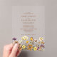 Fije el tono de su boda con esta elegante invitación a la boda acrílica de Terracota Wildflower Boho Fall. Con sus delicadas acuarelas floridas en cálidos tonos de otoño (terracota, naranja quemado y amarillo dorado) que florecen suavemente en el fondo, esta invitación se imprime en acrílico claro para un look moderno y sofisticado. La elegante caligrafía de terracota añade un acabado minimalista y elegante, ideal para las novias que buscan una mezcla de encanto rústico y moda moderna. ✨ Invitación acrílica con un fondo claro ✨ Flores acuáticas caídas en tonos cálidos ✨ Elegante escritura terracota moderna ✨ Perfecto para bodas boho, rústicos de moda, jardín o al aire libre ✨ personalizable completo para adaptarse a su visión