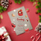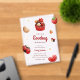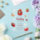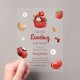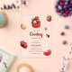 Invitación de baby shower de acrílico con ilustraciones de mariquita, pastelito, flor y fresa en un esquema de colores rojo, blanco y marrón claro. Junto con las ilustraciones se utilizan una fuente de letra script juguetona y una sans serif elegante en la que se escribe toda la información personalizada. Revisa nuestra tienda para ver más artículos de esta colección.