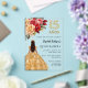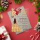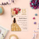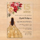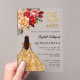 Una invitación moderna, elegante y glamurosa para una fiesta de 15 años en Quinceañera. Un fondo claro y transparente, un chica con un vestido dorado y rosas rojos, rosados y dorados, florales. El nombre está escrito con una escritura de estilo con letras a mano moderna. Personalice y agregue los detalles de su fiesta.
