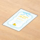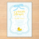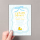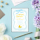 Baby blue gingham baby shower with a hand drawn bow. Water droplets frame a rubber duck surrounded by bubbles