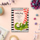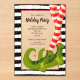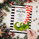 Elf legs in striped tights and green boots on black and white stripes and gold dots, these Christmas party invitation are fun for any holiday occasion. MATCHING items in our store.