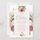 Elegante y moderna invitación al bautismo o a la cristiandad, cuenta con un ramo de rosas de peones acuáticos vivos y coloridos pintados a mano en rosa, frambuesa, blanco y dorado, con un frondoso follaje verde. La invitación se realza con una mariposa dorada, luna y cruz. Personalice fácilmente esta invitación con los detalles de la Navidad de su bebé. La tipografía manuscrita y las letras doradas hacen de esto una elegante invitación al bautizo con espacio para la ceremonia religiosa y una recepción o fiesta después. El reverso de la tarjeta es un bonito de color rosa suave, la invitación perfecta para bautizar a una bebé.