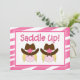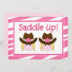 Invitaciones para fiestas de cumpleaños con el tema del Gran Cowboy a dos vaqueras gemelas. El diseño tiene la palabra Saddle Up. Utilice nuestra plantilla fácil para personalizar con su información.