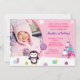 Un dulce diseño de pingüino de invierno, perfecto para una fiesta de cumpleaños. Agrega la foto de tu hijo y tu propio texto. Línea completa de artículos de coordinación disponibles en nuestra tienda.