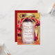 Invitación a una fiesta de Navidades rústicos con un frasco de albañil con cinta roja y rústica etiqueta de Santa suspendida a un lado del frasco de albañiles. Agregue su propio texto de invitación de fiesta de vacaciones a esta plantilla. Si necesita añadir o borrar líneas de texto, utilice el botón "Personalizar". El dorso de la invitación es rojo sólido.