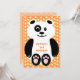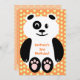 Las invitaciones adorables de la fiesta de cumpleaños para los niños ofrecen un fondo anaranjado con los lunares ligeros de la verde lima. En primer plano está un oso de panda blanco y negro grande, juguetón con una sonrisa grande. El oso de panda se está sentando y en el vientre blanco el área de la panda es sitio para su texto, que puede ser modificado para requisitos particulares. El dorso de la invitación tiene el mismo diseño del lunar del naranja y del verde en tonos silenciados con un área más oscura para su texto que esté en fuente de la verde lima. el texto se puede modificar para requisitos particulares para adaptarse a sus necesidades. ¡Los niños amarán este diseño adorable del oso de panda, especialmente los que sean amantes animales!