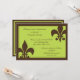 Este las invitaciones intemporales del chocolate y de la cal del acontecimiento de la flor de lis son perfectas para cualquier acontecimiento de duchas nupciales a las cenas del ensayo. Las invitaciones ofrecen los símbolos marrones de la flor de lis puestos a los left and right de la invitación con una frontera marrón en un fondo de la cal. Complete la plantilla de su información de acontecimiento. Haga clic el "personalizar él" para realizar cambios más extensos a la colocación de la fuente y del texto.
