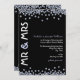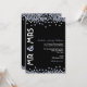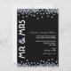 Una bonita y moderna invitación de aniversario de bodas de diamante en negro y blanco con toques de azul pálido. En los bordes superior e inferior de la invitación hay piezas de purpurina de diamante dispersas, formando un borde parcial. En el lado izquierdo de la invitación está "Sr. y Sra." en una fuente en negrita, mientras que el texto de la invitación está alineado en el lado derecho. Se ha elegido una divertida mezcla de estilos de fuentes modernas para acentuar el diseño.