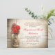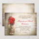 Fondo de madera rústica romántico y tarro de masón con flores rojas para fiesta de aniversario de boda o invitaciones para cena de aniversario. Sugiero un hermoso papel con textura de lino para este diseño.