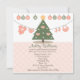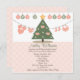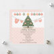 Un árbol de Navidad decorado con adornos de corazones rosados con una estrella en la parte superior y una línea de ropa de bebé detrás adornan estas hermosas y preciosas invitaciones de baby shower de Navidad para una niña. Los adornos cuelgan en alto deletreando "¡Es una niña!". Un par adorable de pantaloncitos rosados y zapatitos de bebé y un babero cuelgan detrás del árbol. Haga clic en el siguiente enlace para ver todo nuestro arte original de Chrissy H. Ilustración © Chrissy H. Studios, LLC. Todos los derechos reservados.
