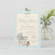 Invitaciones de baby shower shabby chic con carruaje de bebé vintage, osito de peluche y regalos en un fondo floral y de rayas vintage. Esta dulce invitación de baby shower vintage para niñas se personaliza fácilmente para su evento simplemente agregando sus detalles en el estilo de fuente y la redacción de su elección.