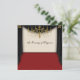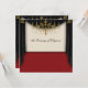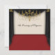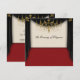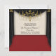 Invitación para baile de graduación escolar con alfombra roja, cortinas negras y candelabro dorado.