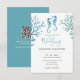 Estas invitaciones a bodas de playa cuentan con caballitos de mar de color agua en suaves tonos azules, ofreciendo un diseño costero y único, perfecto para celebraciones junto al mar. La parte trasera de la tarjeta incluye espacio para tu código QR, lo que facilita a los huéspedes el RSVP en línea mientras ahorran papel, una opción ideal para bodas sostenibles o parejas que planean un presupuesto. Disponibles como tarjetas impresas o impresas profesionalmente, estas invitaciones con temática de caballito de mar le dan encanto y comodidad a su día especial. Arte y diseño únicos por Victoria Grigaliunas de Do Tell A Belle.