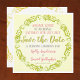 Invitación de boda. Guarde la fecha para una ceremonia de boda. Invitaciones de boda con diseño circular y florituras en color dorado.