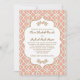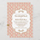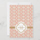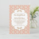 Elegante y hermosa invitación de boda marroquí inspirada en las baldosas francesas, con un diseño repetido de patrones geométricos de coral y oro y florecientes florecientes en tonos dorados. Esta invitación de bodas de lujo y de lujo es perfecta para un boda de temática marroquí, árabe o aladino. La parte posterior de estas invitaciones y invitaciones de marco sofisticado y personalizado pueden ser personalizadas con el monograma de la novia y el novio que pronto se casarán y los nombres en forma de quatrefoil. Pintura y diseño © Chrissy H. Studios, LLC. Todos Los Derechos Reservados.