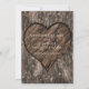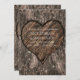Invitaciones de boda rústicas con tronco de árbol tallado con corazón.