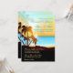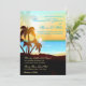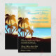 Invitaciones a la Boda de Playa Palm Trees y Ocean Sunset. Utilice esta plantilla para personalizar de sus propias invitaciones de bodas de playa personalizadas o invitaciones a eventos de fiesta de playa. Incluye azul, agua, amarillo, naranja, bronce y negro para una boda perfecta en la playa de verano.