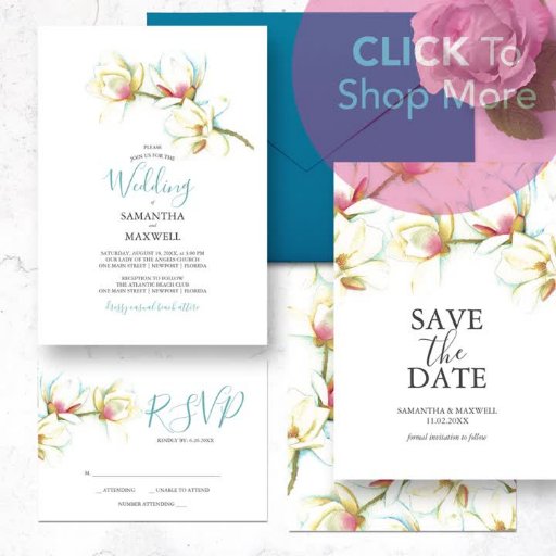 Esta elegante invitación a la boda incluye sus nombres en una elegante tipografía manuscrita con detalles del evento en un clásico tipo de letra serif de carbón gris sobre un fondo blanco nítido con una parte superior de mi floral original de magnolia blanca color agua. La tarjeta de invitación se revierte a un color turquesa gratuito que se puede personalizar para que se adapte a su tema boda deseado. Una moderna pero mala elección para los bodas de verano en el sur del clima o en Florida. Para ver toda la suite de Victoria Grigaliunas visita www.zazzle.com/dotellabelle