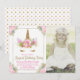 Invitaciones de cumpleaños de unicornio con dulce cara de unicornio floral rosa y dorado con pestañas doradas y cuerno floral en un hermoso fondo floral rosa y dorado. Esta dulce invitación de cumpleaños de unicornio se personaliza fácilmente para su evento simplemente agregando su foto y detalles. También puede cambiar el color de fondo en esta adorable invitación de unicornio. Este es un diseño impreso sin purpurina real.