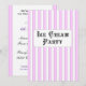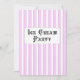 Invitaciones personalizadas con rayas rosadas y Fiesta de Helado en la parte delantera en letras victorianas vintage y letras de bloque y escritura personalizada en la parte trasera. Haga clic en Personalizar para cambiar las fuentes, los colores de fondo, el tamaño y más, incluso guardar su diseño para más tarde.