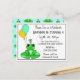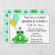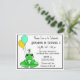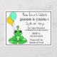 Invitaciones de cumpleaños con una rana linda sentada en una hoja de nenúfar con un sombrero de cumpleaños y globos. Divertido para la fiesta de cumpleaños de un niño pequeño.